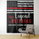 Dieses Design verfügt über eine Feuermelder mit schwarz-weißen Streifen und einen dünnen roten Streifen. Der Text "The Legend is Retiring" steht über dem Namen des pensionierten Feuerwehrmanns, Lieutenant oder Chefs der Strafverfolgungsbehörden. Feiern Sie stilvoll mit dieser tollen Banner-Kulisse, die Sie vor Ihren Augen fotografieren können!