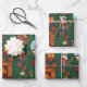 Gifts and Decor: Interspersed are classic Christmas elements like wrapped gifts, stars, Christmas trees, and mugs of cocoa, all rendered in a bold, rich color palette.