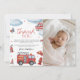 Adorable firetruck-themed photo thank you card featuring watercolor fire engines, firefighter gear, clouds, and rescue helicopter illustrations. Includes space for a personalized message and a photo of your little one. Perfect for firefighter or fire station–themed first birthdays and kids’ parties. Great for printable or digital use and fully customizable.
