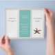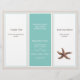 Dreispurfarbene Broschüre in türkisblau-grün, weiß und braun mit Seestern. Passen Sie sechs Paneele an, drei auf jeder Seite von erschwinglichem Flyer-Papier. Geben Sie Informationen über das Geschäft oder die Dienstleistung, mit einem Ort für einen über Abschnitt, um eine selbstständige. Die braunen Seesterne / Seesterne können durch ein Logo ersetzt werden. Die Panels wechseln sich zwischen weiß mit dunkelbraunem Text und türkisblau mit weißem Text ab. Geben Sie Bürozeiten, den Geschäftsstandort und viele weitere Informationen zu den Dienstleistungen ein. Das 8,5 x 11 Zoll Papier wird vom Käufer gefaltet. Karo des gesamten Textes auf Richtigkeit, da vor dem Versand keine Korrekturlesen durchgeführt wird.
