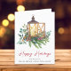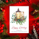 Firmenfeiertag gefaltete Grußkarte mit einer Aquarellfarbe einer Weihnachtskerzenlatte in einer Anordnung von saisonalen Kiefern, Eukalyptusbeeren und Grünpflanzen. "Happy Holidays" ist in einem zeitgenössischen roten Drehbuch geschrieben und Sie können Ihren Gruß und den Namen Ihres Unternehmens in einfacher moderner Typografie personalisieren. Fügen Sie im Inneren eine zusätzliche Nachricht von Kundenzufriedenheit und Ihrem Firmenlogo hinzu.