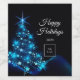 Ein trendiger und moderner Weihnachtsweinlabel für ein Unternehmen, ein Unternehmen. Ein schwarzer Hintergrund mit einem glänzend blauen Weihnachtsbaum, der mit Sternen geschmückt ist. Mit dem Text: Happy Holidays geschrieben mit modernen großen weißen Hand Schrift, weißen Buchstaben. Vorlagen für Ihr Logo und ein Jahr. Perfekt als Geschenk für Ihre treuen Kunden oder Mitarbeiter