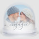 Commemorate your engagement with this beautiful modern keepsake snow globe. The text of Side 1 reads "Our first Christmas engaged," with the word "engaged" in elegant dusty blue handwriting script with flourishes before and after. On Side 2, add your names in the same dusty blue calligraphy script, with the year below in sans serif font. Replace the two sample images with your favorite photos. A white gradient filter helps make the text pop.