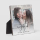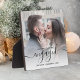 Commemorate your engagement with this beautiful modern keepsake plaque. The black text reads "Our first Christmas engaged," with the word "engaged" in elegant handwriting script with flourishes before and after. Replace the sample image with your favorite photo, and add your names and the year. A white gradient filter helps make the text pop.