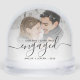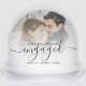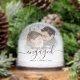 Commemorate your engagement with this beautiful modern keepsake snow globe. The black text reads "Our first Christmas engaged," with the word "engaged" in elegant handwriting script with flourishes before and after. Replace the sample image with your favorite photo, and add your names and the year in black sans serif font. A white gradient filter helps make the text pop.