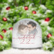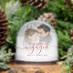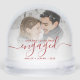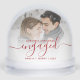 Commemorate your engagement with this beautiful modern keepsake snow globe. The festive red text reads "Our first Christmas engaged," with the word "engaged" in elegant handwriting script with flourishes before and after. Replace the sample image with your favorite photo, and add your names and the year in red sans serif font. A white gradient filter helps make the text pop.