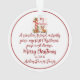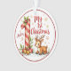 Celebrate the wonder of a baby's first holiday season with this heartwarming “My 1st Christmas” ornament. At the center sits a large, Candy Cane Striped number one adorned with delicate snowflakes, pine branches, red berries, and a cheerful red bow. Nestled beside the number is a sweet cartoon-style baby reindeer, seated on a snowy base and surrounded by softly falling snowflakes. The text “My 1st Christmas” appears in a playful mix of red and green script, adding a joyful touch to the wintry scene. A customizable name appears on the left side in elegant cursive, making this ornament a truly personal keepsake.