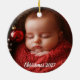 Celebrate a milestone year with a charming design featuring a hand-painted watercolor teddy bear beside a festive evergreen tree. This keepsake allows you to showcase a favorite newborn portrait alongside elegant, storybook-style illustrations and traditional red and green accents. It makes a thoughtful memento for parents and grandparents looking to preserve the magic of a child's very first holiday season.