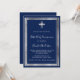 Modernes, elegantes und einladendes Hotel. Ein marineblau mit einem Kreuz dekorierter Hintergrund, Imitate silberne Rahmen. Personalisieren und fügen Sie einen Namen und Details. Weißer Text.