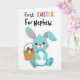 This card features a stylized aqua-blue bunny sitting on a bright white background, with pink inner ears, a tiny nose, and rosy cheeks that give it a sweet, friendly look 🐰. Its large black eyes have small white highlights, and the slightly tilted ear adds a bashful, affectionate touch, like it’s posing for someone it cares about. The bunny holds a smooth white oval close to its lighter belly, as if gently protecting a little gift. To the side, a small woven basket sits nearby, filled with decorated eggs in purple, red, green, yellow, and blue, with a mix of stripes and solid patterns 🌷. Near the top, the phrase “First For Nephew.” appears in black lettering, centered above the main illustration. Just below that, “EASTER” is written in a row of multi-colored letters, each one a different bright shade that echoes the eggs below. The bunny is drawn with rounded shapes and soft shading, and one ear angles outward while the basket rests close by with eggs spilling upward in a neat cluster.