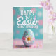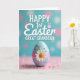 This card features a bright aqua background with soft pink and white blurred circles, creating a gentle, dreamy setting for a first Easter 🐰. Across the upper half, the message “HAPPY 1st Easter GREAT GRANDSON” sits large and centered in a clear, cheerful style, standing out strongly against the cool backdrop. Near the text, a simple bunny face with long ears and fine whiskers appears in soft lavender, adding a sweet, friendly touch 🐇. The lower portion is anchored by a large egg shape in smooth sky blue, decorated with small pink and yellow candy-like dots that feel like little confetti. A thin pink ribbon wraps around the egg’s middle, like a tidy band that hints at a gift passed along with care. Resting on the egg is a white, many-petaled flower with a sunny yellow center, like a small token of affection placed right where the eye lands. Along the bottom edge, a vivid pink area is sprinkled with tiny multicolored specks, like scattered sugar dots across the foreground.