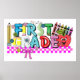 This bright and cheerful design celebrates the excitement of first grade with bold multicolored letters spelling “FIRST GRADE,” each decked out in playful patterns like florals, polka dots, and stripes. Surrounding the typography are classic school icons—pencils, crayons, a smiling apple, and a soaring paper airplane—that add a sense of movement and joy. A pink checkered base with a bow and floral accents softens the composition, enhancing its whimsical, welcoming feel. Perfect for customizable classroom decor or materials that highlight the joyful adventure of early education.
