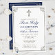 Erste Einladungskarten der Heiligen Kommunion mit einem Kreuz und einem wunderschönen Rahmen in Silbertönen. Die Typografie der Karte vereint elegante Kalligrafien mit modernem minimalistischem Text in silbergrauen und marineblau Farbtönen. Die Vorderseite der Karte ist weiß, während die Rückseite blau mit Kreuz und Rahmen ist. Erhältlich in hoher Druckqualität oder als Download, mit sofortigem digitalen Download-Format für Textnachrichten, E-Mail oder Social Media-Beiträge.