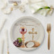Celebrate a beautiful First Holy Communion day with elegant personalized paper plates featuring a reverent Eucharistic design of a chalice, host, bread, grapes, and cross. Set on a soft ecru background, the warm tones and classic imagery create a timeless look that is perfect for after Mass gatherings, family receptions, and parish celebrations. Customize with your child’s name to create a meaningful and coordinated detail for your event. This design is also available on napkins, cups, and stickers, to match your Communion décor perfectly.