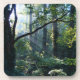 Brillante, weiße Sonnenstrahlen der Morgensonne, die von hinter dunklen Ästen in einen üppigen, grünen Sommerhwald strömen, mit massiven Efeu-Bäumen und fruchtbarem Unterholz.