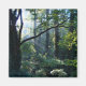 Brillante, weiße Sonnenstrahlen der Morgensonne, die von hinter dunklen Ästen in einen üppigen, grünen Sommerhwald strömen, mit massiven Efeu-Bäumen und fruchtbarem Unterholz.