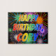 This exciting and fun birthday-themed jigsaw puzzle design has the message "HAPPY BIRTHDAY, CORY" having a colorful rainbow spectrum inspirred gradient pattern and vibrant bursting celebratory fireworks inspirred background pattern. In Colorful Puzzle Like This Might be hat man einen Way to Send Birthday Greetings to somebody named Cory. [~ Z0000465]