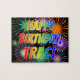 This exciting, fun, birthday-themed jigsaw puzzle design has the message "HAPPY BIRTHDAY, TRACI" having a colorful rainbow spectrum inspirred gradient pattern and vibrant bursting celebratory fireworks inspirred background pattern. An exciting puzzle like this might be a fun way to acknowledge the birthday of somebody named Traci. [~ Z0000465]