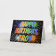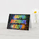 This multicolored and fun birthday greeting card design feature the message "HAPPY BIRTHDAY" and the common first name "TROY" with the letters having a colorful rainbow spectrum like gradient coloring pattern. The background of the front feature a colorful pattern inspired by the look of bursting celebratory fireworks. The inside feature a customized greeting message, or could perhaps be cleared and left blank if a message is to be written by hand instead. Birthday greeting card like this could be fun to give to somebody named Troy on their birthday. [~ Z0000350]
