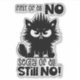 A funny, sarcastic black-and-white graphic design showcases a black cat with frazzled fur and a scowling expression. The black handwritten text says, "First of all, no. Second of all, still no!" Available on a wide variety of products, this design makes a perfect gift for cat lovers.