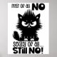 A funny, sarcastic black-and-white graphic design showcases a black cat with frazzled fur and a scowling expression. The black handwritten text says, "First of all, no. Second of all, still no!" Available on a wide variety of products, this design makes a perfect gift for cat lovers.