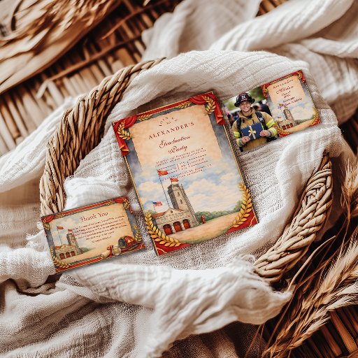 A bold firefighter graduation design featuring classic ceremonial elements, rich red and charcoal tones, and a traditional laurel frame symbolizing achievement and service. The illustrated helmet, turnout gear, and badge create a proud, respectful look perfect for honoring a firefighter’s milestone moment. Ideal for academy graduations, promotions, and first responder celebrations with a timeless, dignified style.