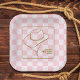 First rodeo, western pink checkered, 1st birthday party paper plates. Create a fun wild wild west theme first birthday party with vintage checkered plates with a simple outline of a brown cowboy hat and party details. Customize with your information. Matching party supplies, invitations and signs are available in the First Rodeo Pink Cowgirl 1st Birthday Baby Girl Collection in The Gathering Designs store.