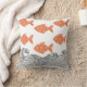 Fische und Wellen werfen Kissen. Die Fische werden in einer weichen Terrakotta-Orange gerendert und mit einem zarten Blumenmuster dekoriert, das eine skurrile, japanisch inspirierte Touch hinzufügt. Die Wellen unten sind illustriert mit feinen, schwarzen Linien in einem traditionellen Holzblock-Stil.