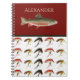 Notebook Fishing Fliegt Rustikaler Lachs Wasserfarben Design. Dieses Design ist ideal für Geschenke für Fischer. Ideal für Zuhause- oder Ferienwohnungen am Gebirgssee oder am Ozean. Vintages Katalogbild von Mary Orvis