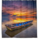 Fischerboot dem Strand an des Sonnenaufgang-| Duschvorhang