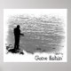 Lasst uns davon wegkommen und angeln gehen! Einfache Anpassung oder Entfernung des Textes auf diesem Plakat, das ein Schwarz-Weiß-Bild eines einsamen Fischers zeigt, der auf einem Felsvorsprung am Seneca See in Genf, New York stehend ist. Der Text lautet: Gone fisin'