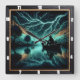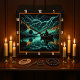 Eine bemerkenswerte Abbildung zeigt einen Fischer in einem Boot auf einem dunklen See, beleuchtet von einem brillanten Blitzsturm. Die abstrakten, leuchtenden Linien und der scharfe Kontrast zwischen Licht und Schatten schaffen eine stimmungsvolle und abenteuerliche Atmosphäre. Die Berge und eine einsame Ente verleihen der dramatischen Szene ein Gefühl von Platz.