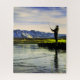 Angeln auf einem Bergsee an einem schönen sonnigen Tag mit schneebedeckten Bergen im Hintergrund. Die Natur ist schön.