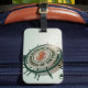 The image showcases a circular sign with a nautical theme, featuring a large, stylized crab in the center. The sign reads 'Fisherman's Wharf of San Francisco' in a yellow, outlined font against a white background. The sign is surrounded by a dark green, wooden frame with eight spokes resembling a ship's wheel. The background is a bright, clear sky, suggesting a sunny day