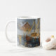 Celebrate the season by the sea with this elegant coastal Christmas mug. A row of fishing boats, decorated with festive wreaths and glowing lights, rests in a snowy harbor as a Christmas tree sparkles in the distance.
