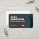 A professional business card for a personal trainer featuring a clean modern layout with a dumbbell icon. The background features subtle colors from charcoal gray to deep navy blue, with one corner showing a dynamic silhouette of a person in a workout pose, conveying strength and movement. Perfect for personal trainer, coach, fitness or bodybuilding.