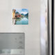 Souvenir Foto Magnet mit den bunten Häusern des kleinen Dorfes Fjaerland mit Reflektion im Wasser des Fjaerlandsfjords, ein Zweig des Sognefjords, umgeben von großen Bergen in Sogn og Fjordane, Norwegen.