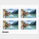 Rechteckiger Aufkleber mit den farbenfrohen Häusern des kleinen Dorfes Fjaerland mit Reflektion im Wasser des Fjaerlandsfjords, einem Zweig des Sognefjords, umgeben von großen Bergen in Sogn og Fjordane, Norwegen.