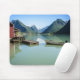 Mousepad mit einer Landschaft mit einem Boot und einem Boathouse im ruhigen Wasser des Fjords Fjaerlandsfjord mit Bergen im Hintergrund in Norwegen