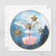 Karte mit einem skurrilen Bild eines jungen Mädchens mit Engelsflügeln, die in einem sternförmigen Winterhimmel tanzen.
