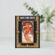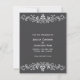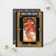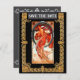 Save the Date Hochzeitskarte mit grauem Rücken. Front zeigt Alphonse Muchas Tanz. Zurück enthält zwei Schnörkel mit den Personalisierten Details der geplanten kommenden Hochzeit.