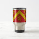Reise-Cup mit Design mit einer Fahne des historischen Landkreises von Anglesey, in Wales, Großbritannien; rote Fahne mit gelben Zickzack und drei Löwen; die zugeschriebenen Arme von Hwfa ap Cynddelw, das traditionelle Abzeichen des Landkreises