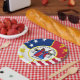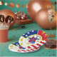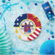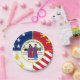 Papierplatte mit der Flagge der Stadt Detroit, Michigan; rote, weiße und blaue Fahne mit US Flagge, Lilien, Drachen und Siegel der Stadt