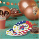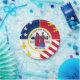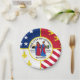 Papiertafel mit der Fahne der Stadt Detroit, Michigan; rote, weiße und blaue Fahne mit US Flagge, Lilien, Drachen und Siegel der Stadt