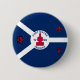 Round Button mit Fahne der Stadt Fort Wayne, Indiana; blaue und weiße Flagge und rote Blockhütte in der Mitte und drei Illustrationen im blauen Feld - Illustration des Kopfes der Indianer, französischer Lilie und britischer Löwe