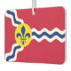 Air Freshener mit der Fahne der Stadt St. Louis; rote Flagge mit weißen und blauen Wellen und blaue Flöte in gelbem Kreis