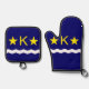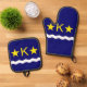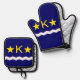Pot Holder Set mit Design mit der Fahne von Kinshasa, Hauptstadt Stadt der Demokratischen Republik Kongo, blaue Fahne mit Weißwelle, zwei goldene Sterne und Buchstabe "K" in der Mitte