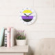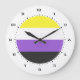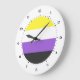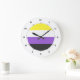 Rundwanduhren mit der nicht binären Stolperflagge. Eine gelbe, weiße, lila und schwarze Flagge der nicht binären Stolperbewegung