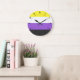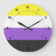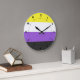 Große Wanduhr mit der nicht binären Stolperflagge. Eine gelbe, weiße, lila und schwarze Flagge der nicht binären Stolperbewegung