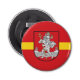 Button bottle opener with design with flag of Vilnius, capital city of Lithuania; red flag with yellow stripe and coats of arms with two golden lions holding a shield in the center